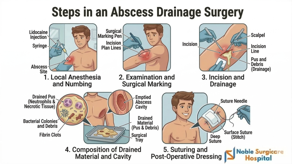 Noble Surgicare Hospital provides expert abscess drainage surgery, ensuring the effective removal of painful infections and pus buildup. Their skilled surgical team prioritizes patient relief and safety throughout every procedure.