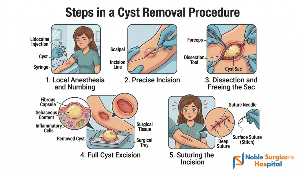Noble Surgicare Hospital provides professional cyst removal surgery, ensuring the safe and effective treatment of bothersome skin lumps. Their skilled surgical team prioritizes patient comfort and aesthetic results throughout every procedure.
