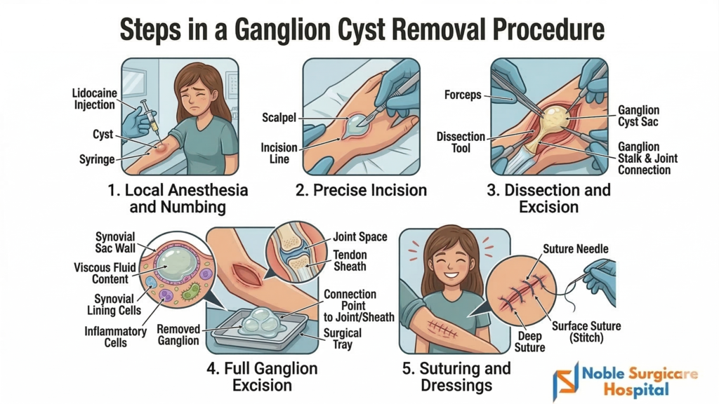 Noble Surgicare Hospital provides expert ganglion removal surgery, ensuring the effective treatment of painful joint or tendon cysts. Their skilled surgical team prioritizes patient comfort and safety throughout every procedure.