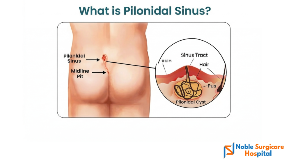 A pilonidal sinus is nothing but a hole or tunnel that forms at the lower back, at the crease line of the buttocks. It may appear as a dimple in the skin and is generally not a cause of concern.